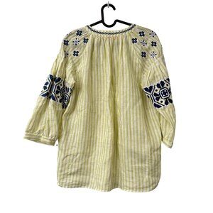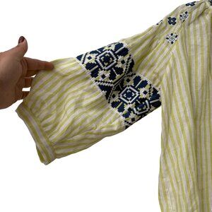 Vilagallo Chartreuse Navy Embroidered Striped Linen Peasant Blouse Womens Large