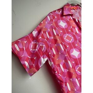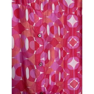 Bring back the bold with this retro-inspired silky blouse! Eye-catching mod print in vibrant pink, orange, and white tones.Lightweight and breathable with a relaxed, oversized fit.