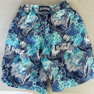 Stylish Vilebrequin swim trunks for kids. Features a vibrant blue and white pattern. Perfect for beach days.