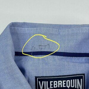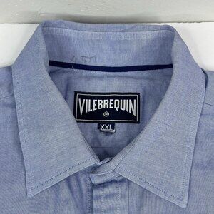 Vilebrequin men's size XXL shirt, it is a Business Career style, color is blue, button-down front closure, point collar, long button sleeves, soft thick fabric and with logo on front and back. Materials 100% cotton. Care machine wash, line dry. Condition is preloved very good with writing on inner collar, not visible when wearing as shown in the pictures. Please preview the measurements to ensure fit. MFSR $260.00