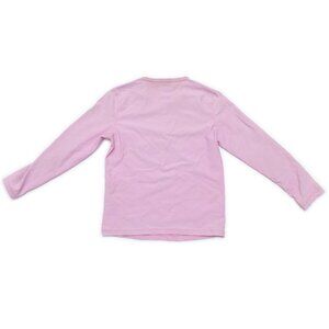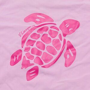 Girls' Vilebrequin Long Sleeve Rash Guard, light pink with dark pink turtle graphic. Graphic appliqué is lifting in some areas on turtle, and missing from parts of "Vilebrequin"–see image, otherwise excellent condition. UPF 50+