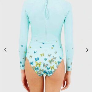 Flutter over the water with the butterflies on the Lexy Butterflies women's long sleved one piece swimsuit.