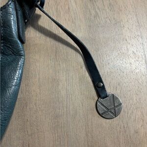 Pouches on front and back outside, pouch and zippered inside pouch, the color is green with dark/black distressing, one scrape on leather as shown in last picture