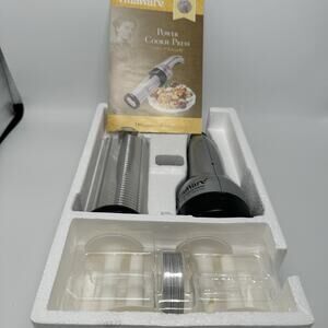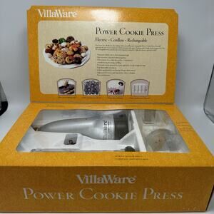 New in box, only opened to take out for the photos. The VillaWare Cookie Press is a cordless, rechargeable cookie press that comes with 20 cookie discs and 4 icing tips. With a solid round shape and a standard size, this silver plastic cookie press is perfect for all occasions. Easy to use and easy to clean, this VillaWare model K3464 is ideal for creating delicious homemade cookies with a fun and convenient method. Designed for food and drink themes, this cookie press is a must-have for any baking enthusiast looking to add some excitement to their cookie-making experience.
