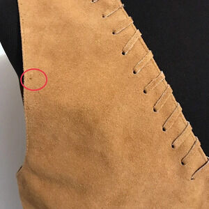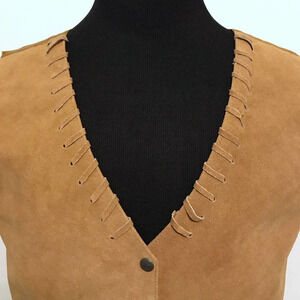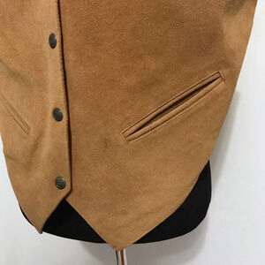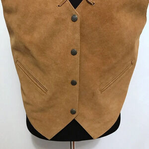 Excellent condition. Vintage Western style Genuine Leather Vest for Men Size M. Snap buttons for closure, 2 front pockets, internal lining, mixed media, loops straps neckline, ties back. Please note and shown as a zoomed in picture, tiny material imperfection right side by armholes. Pictures are part of description.