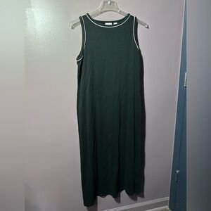 Elegant black dress and cardigan with subtle white piping. Ideal for versatile styling.