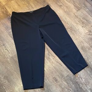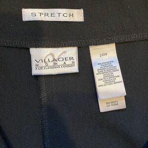 Villager Dress Pants, Black in color. Sides only have elastic. Zipper with hook and button closure. No pockets. 96% polyester 4% spandex. Size 24, waist 23”, rise 14”, inseam 29”, leg opening 10”. Great condition no stains or snags