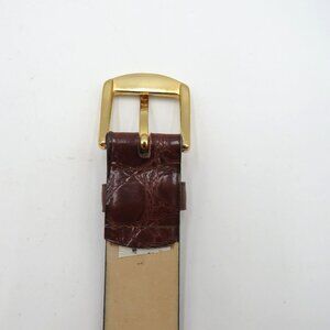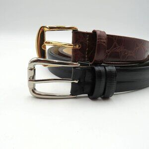 These men's belts features a classic embossed designs in genuine leather. Black belt with silver tone buckle and brown belt with gold tone buckle. Preowned