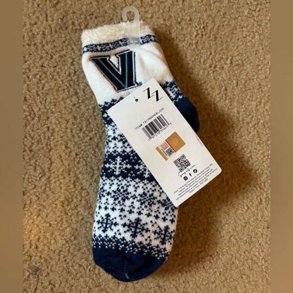Cozy knit socks with Villanova logo. Features a stylish blue and white pattern.