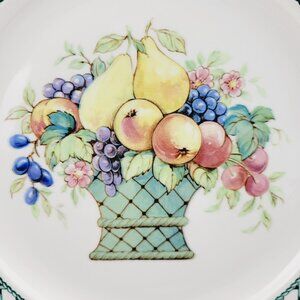 The Vintage Villeroy & Boch Basket Dinner Plate features a charming fruit basket center with a green lattice design. Made in Germany, this discontinued china piece is perfect for collectors or as elegant wall décor.