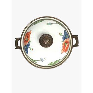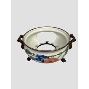 This rare Cookware Fondue Warmer ceramic showcases a vibrant floral motif, complete with a secure lid, dual handles, and a stable footed base, enhancing any dining setting.