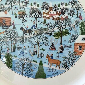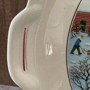 Charming country Christmas winter holiday scene on a thick round porcelain plate with holiday red trim. Perfect for cookies, cakes, and other holiday treats.