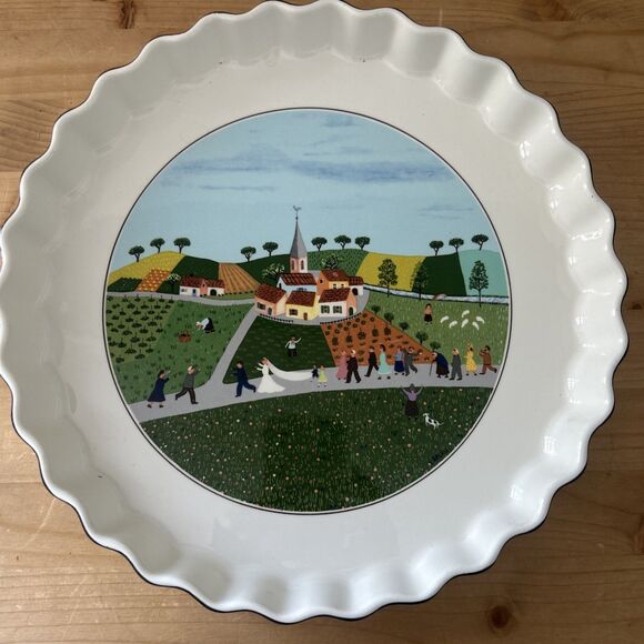 Perfect for sweet or savory tarts, and quiches, this is a lovely Villeroy & Boch porcelain tart dish. This one has a whimsical painted wedding scene painted on the inside, and scalloped edges. The plate is in good condition with a couple signs of use, including a little discoloration on the bottom and a faint knife mark on the inside. Otherwise, no damage, chips, cracks, or crazing.