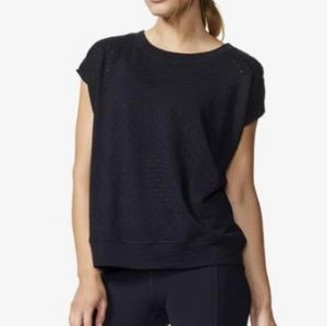 Black flowy work out top - the fabric is like perforated almost with some stretch. Very comfy but cute.