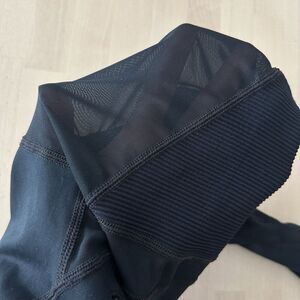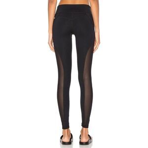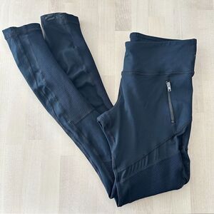 4-way stretch fit. Hidden waist seam pocket. Front zipper details. Contrast ribbed and mesh panel accents.