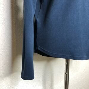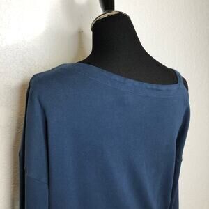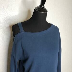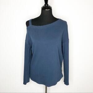 Vimmia slate blue one cold shoulder athletic top. Pullover style with asymmetrical neckline. One cold shoulder. Long sleeves. Size small. Excellent pre-owned condition. Minor wash wear. Material content tag has been removed.