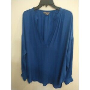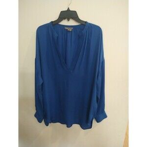The Vince 100% Silk V-neck Long Sleeve Blouse in blue is a stylish and feminine top perfect for various occasions including weddings, parties, and workwear. The blouse features a solid pattern with a flattering V-neckline and long sleeves, making it versatile for all seasons. Made from luxurious silk, this blouse exudes a classic and elegant charm that is sure to make a statement. The medium size and regular fit make it a comfortable and chic choice for any woman's wardrobe.