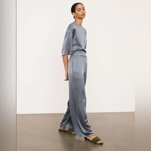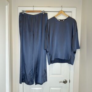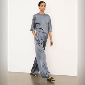 Excellent style and quality lounge wear or casual set. 2 pc set by Vince. Women's XL. New with tags. Retails for 660.00. Pants are a pull-on style with light elastic and drawstring waist. Wider leg with one pocket inseam on each side and a slip button pocket in the back. The top is a pullover style with zip back and dropped 3/4 sleeve. High low hem and slit side. Can be worn untucked or tucked. Smooth satin finish. 100% silk. Dry clean. Overall length of top is 26-29 inches. Sleeve length is 15 inches. Underarm to underarm is 24 inches. Waist of pants is 36-40 inches. Rise is 12 inches. Inseam is 32 inches. This is the perfect lounge wear or casual run errands.