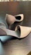 They are color block of charcoal grey and tan with kitten heels that do have scuffs on them. See pics.