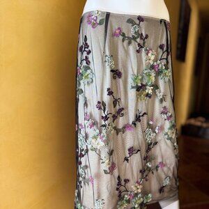 Elevate your wardrobe with this exquisite Vince embroidered mesh midi skirt. Features a sheer black overlay with intricate floral sequin and thread embroidery in multicolor shades over a nude lining. A-line silhouette with a timeless, romantic vibe.