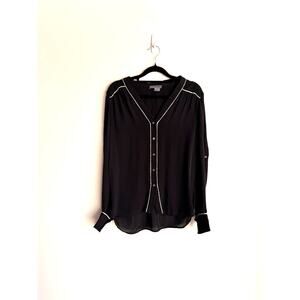 Vince Black 100% Silk Button Front Blouse White Contrast Trim Size Small
