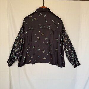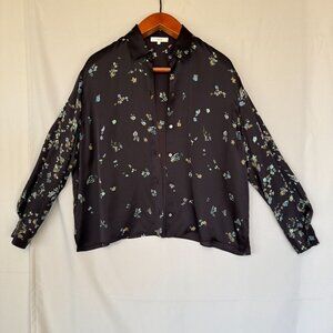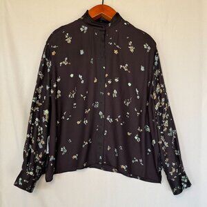 Vince Black Blue Scattered Floral Print 100% Silk Mother of Pearl Button Blouse Size Large