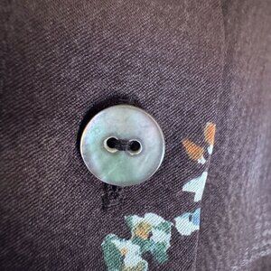 The Scattered Floral Silk Blouse From VINCE is constructed in 1005 Silk black w/ shades of blue, green, brown and tan floral print. It features a high pointed collar, mother of pearl button front closure, relaxed long sleeves with a generous pleat at the mother of pearl button cuff, split bottom hem and a floaty boxy hit a low hip length silhouette. This is boho, classic, coastal, preppy, old money, romantic, feminine, modest, office, day to night, lightweight, work meetings/events, quiet luxury, timeless, moody floral vibes.
