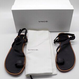 Vince Black Leather Flat Sandals Perrigan Hook and Loop Closure Toe Ring