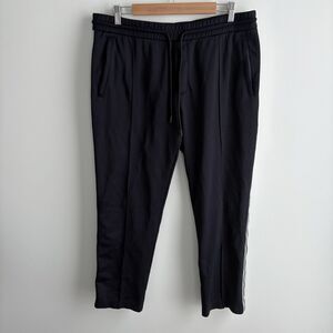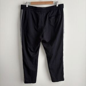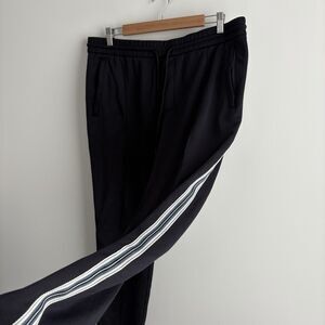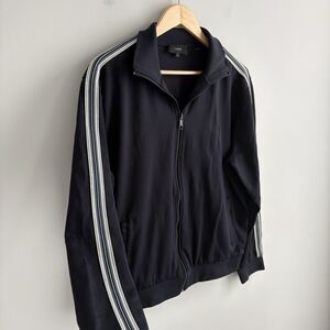 Stylish black jacket with white stripe accents. Matching joggers. Perfect for performance and casual wear. Wear together as a suit or separate for versatile outfits. Features a full zip front and comfortable fit.