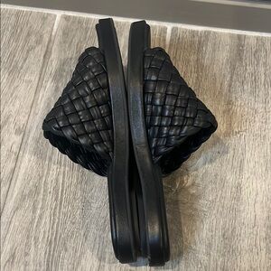 with Vince's black slide sandals, showcasing a distinctive basket-weave design. These minimalist sandals feature a flat sole with a slight platform.