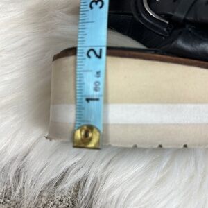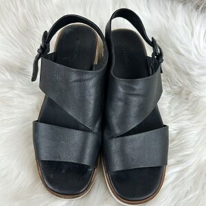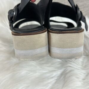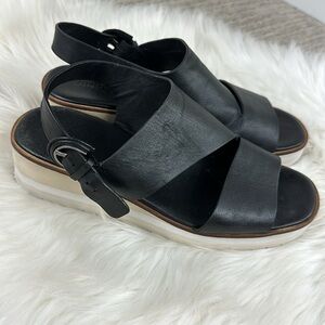 Vince Black Leather Shelby Wedge Platform Sandals 8.5. Adjustable ankle strap. Padded insole, super comfortable. Wedge heel is 2: and platform is 1”