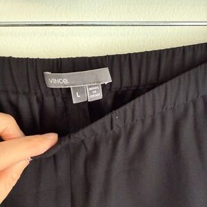 Black silk cargo joggers by Vince. Cargo pockets, elastic waist, elastic at back of ankle cuffs.