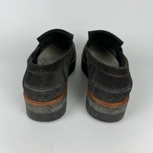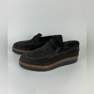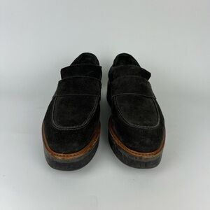 Stunning women’s platform slip on loafers. Black suede. Missing foot insert but otherwise excellent condition. Size 9.5. About 11.75 inches long. Platform about 1.5 inches.