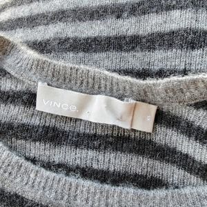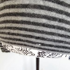 Stylish crew neck sweater with black and gray stripes. Soft and comfortable fabric. Perfect for casual wear.