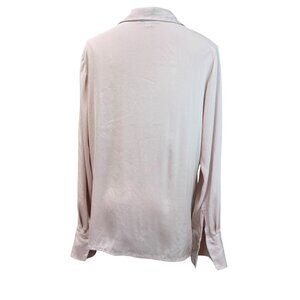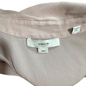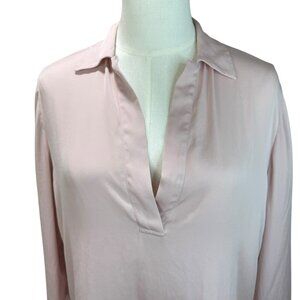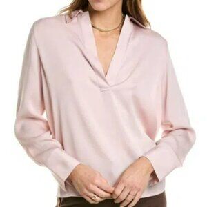 Effortlessly elegant, this Vince blouse is crafted from a luxurious silk blend (92% silk) for a fluid drape and sophisticated feel. The soft blush pink hue adds a delicate, feminine touch, while the minimalist design features a flattering split V-neckline, subtle collar, and relaxed long sleeves with tailored cuffs. Perfect for pairing with trousers for the office or styling with denim for a refined casual look.