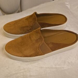 Experience the perfect blend of style and comfort with Vince's brown and tan suede flats. These minimalist slip-ons feature a luxurious suede upper and a contrasting white rubber sole, making them ideal for both casual and dressy occasions. Their clean silhouette and soft texture ensure a sophisticated look with every step.