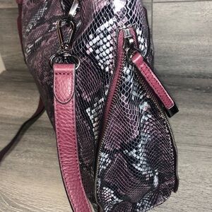 Removable crossbody strap; top handle; top zip closure; back slip pocket; anchor hardware; expandable side zipper; embossed front, back, and sides