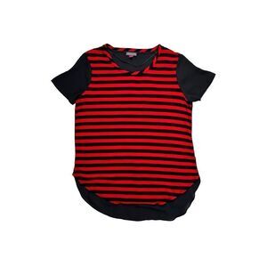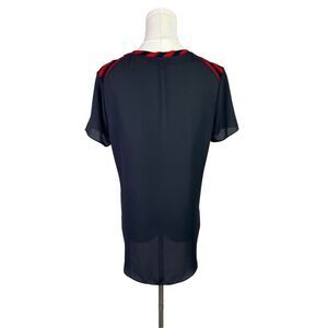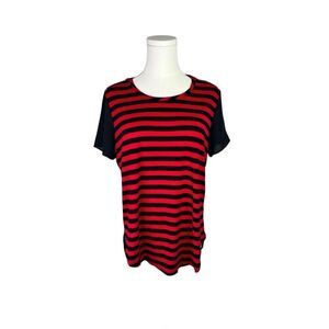 Vince CAMUTO size small red and Black stripe semi sheer short sleeve ladies top. Excellent condition, loose fit & fits true to size. Back & sleeves are sheer black & front is solid striped. Great little top for the office or any casual occasion. See pictures for flat lay measurements. Smoke free, pet free, quick shipping, MAKE OFFERS!