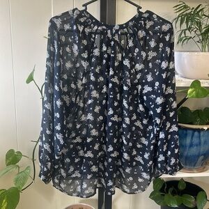 Vince sheer black and white calico, floral-printed 100% silk georgette blouse with subtle smocking at the neck and button cuffs.