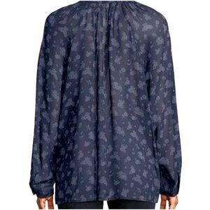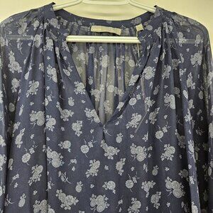 Vince Calico Floral Silk Blouse Top Coastal Blue Dark Blue Long Sleeve Balloon Sleeve Split Neck Sheer Relaxed Fit Pleated Details Lightweight NWT Women’s
