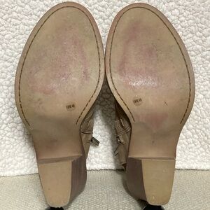 Vince Camaro Women's Tan Leather Karinta Open Toe Booties w/ Block Heel Shoes. Color: Taupe. Pre-owned Condition - refer to pictures for description of shoes. No Rips or Tears. Smoke-Free. 4" Heel Height.