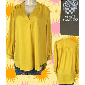 ITEM: Vince Camuto +1X Yellow Marigold Hammered Satin Split Neck Step-Hem 3/4 Sleeve Blouse