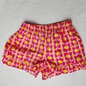 Adorable girls' outfit set. Blue ruffled top with matching scrunchie. Pink and yellow patterned shorts. Perfect for summer.