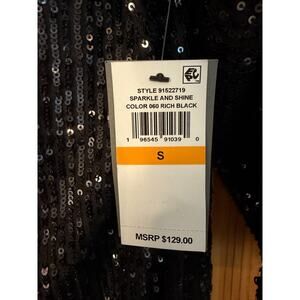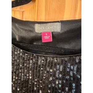 This Vince Camuto 3/4 Dolman Sleeve Black Sequin Sheath Holiday Dress in size small is a glamorous and stylish outfit perfect for parties, formal events, or holiday celebrations. Made from polyester and spandex, the short mini dress features a crew neck and a pullover closure, making it easy to wear. The dress is lined and adorned with sequin accents, adding a touch of sparkle and sophistication. The black color and solid pattern give it a versatile appeal, suitable for any season, whether it's winter, summer, fall, or spring. Perfect for women looking to make a statement with their outfit choice.