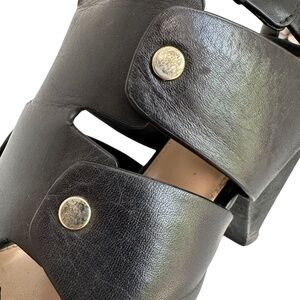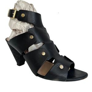 Vince Camuto Smooth Black Leather Rustic Ankle Strap Heeled Sandal.