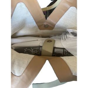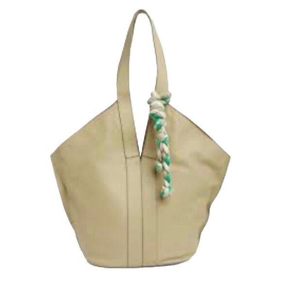 It no longer has the green rope type thing tied to it in the first photo. Great bag, I just realized it’s too structured of a style for me so I’m not reaching for it.