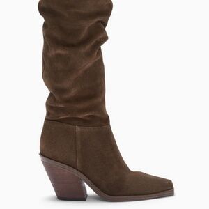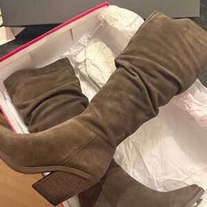 The Vince Camuto Alimber boot is a slouchy, knee-high suede boot, featuring a square toe, stacked heel, and an interior zipper for easy on and off.