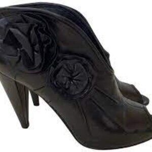 Signature Vince Camuto Alta shootie in Nappa Leather with beautiful rosette side detail. Features peep toe and V plunge front. Classic cone heel. Leather outsole. Rear zip closure with silver hardware.
