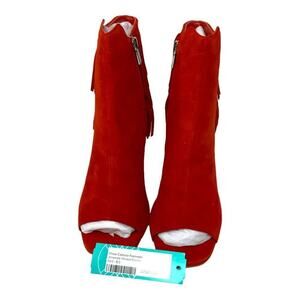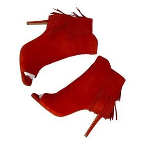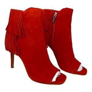 Vince Camuto Amenala Red Stiletto Heel Peep Toe Bootie Size 8.5; Free-spirited fringe accents detail the back heel of this statement-making sandal-bootie crafted from supple suede.