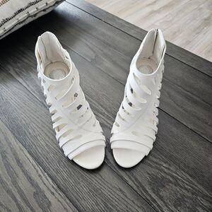 Vince Camuto Amendia Bootie. Women's size 8. Preowned in excellent condition. This strappy open-toe ankle boot set on a lofty cone heel is a contemporary-chic addition to any look. The high heel measuring at 3-3.9 inches provides a comfortable fit while still maintaining its shape. Crafted with high-quality leather and a foam insole, these boots are both durable and comfortable. The rubber outsole ensures a secure grip on any surface.